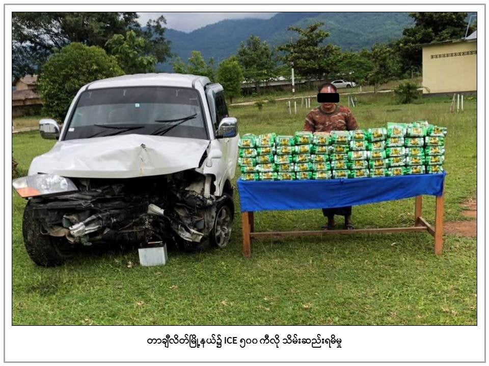 Anti-Narcotics Drug Squad forced to stop a Mitsubishi Pajero driven by Aik Wun for checking on Tachileik-Wan Pong motor road in Wan Pong village, Tachileik Township on Wednesday and the vehicle was driven away. The vehicle was stopped as it crashed with the signboard at the entrance of Wan Pong village. Police arrested Aik Wun and seized 500-kilo of ICE kept in 25 polyethylene bags.