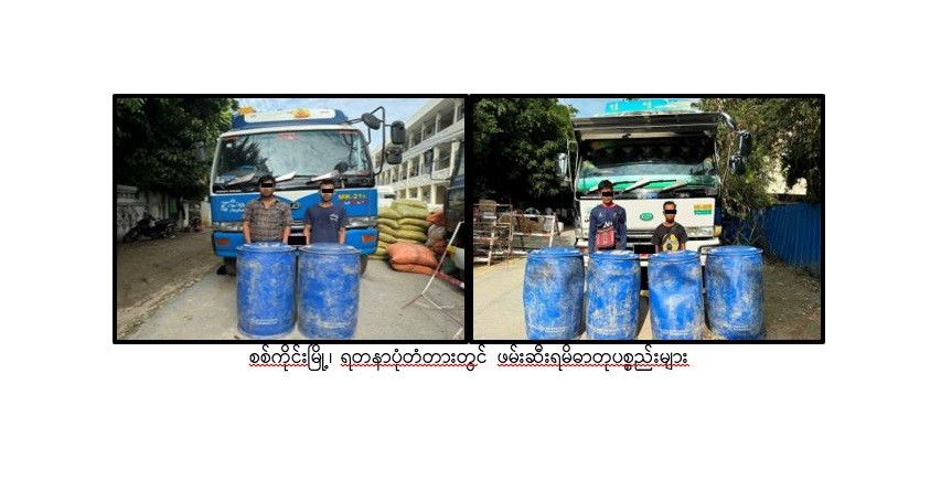 On August 13th, a combined team of the security forces stopped and searched two 6-wheeler vehicles on Yadanapon Bridge in Sagaing, and discovered over 1,000 tons of Propiophenone. Further investigation revealed the seizure of Caffein and Ammonium Chloride on the 14th and 16th of August respectively.