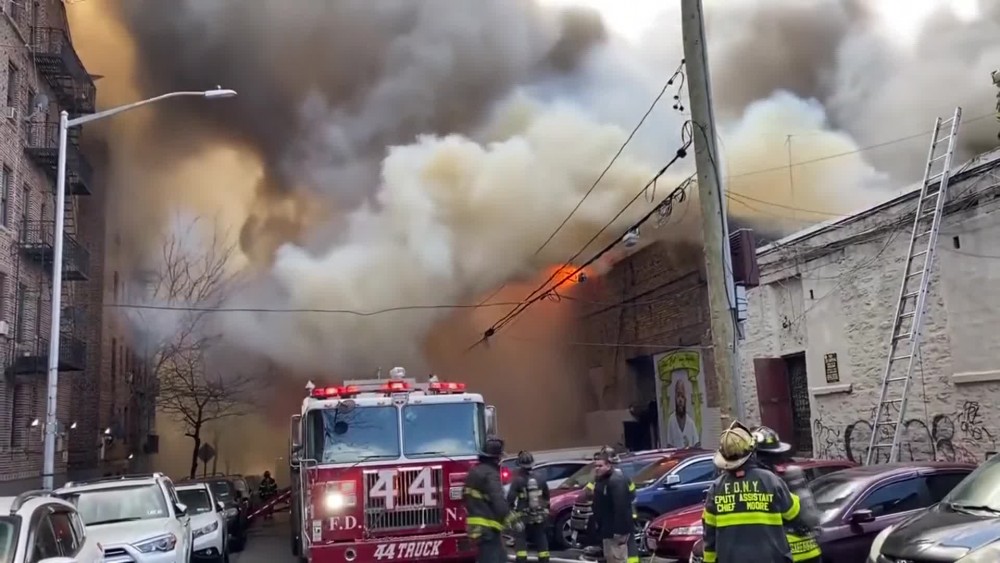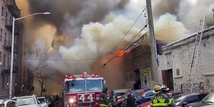 Flames broke out just before noon, according to WABC-TV. On Sunday evening, the FDNY was still attacking what was left of the fire but captured the moment a lithium-ion battery from an e-bike burst into flames.Mayor Eric Adams described the fire as 'chilling' and credited the massive response with saving lives.
