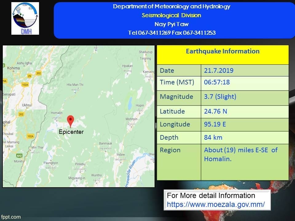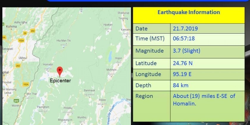 A 3.7-magnitude earthquake hit with its epicenter about 19 miles east-southeast of Homalin Township on Sunday morning, according to the Department of Meteorology and Hydrology.