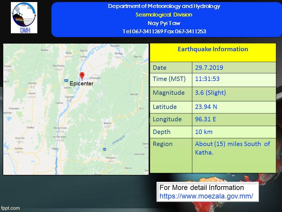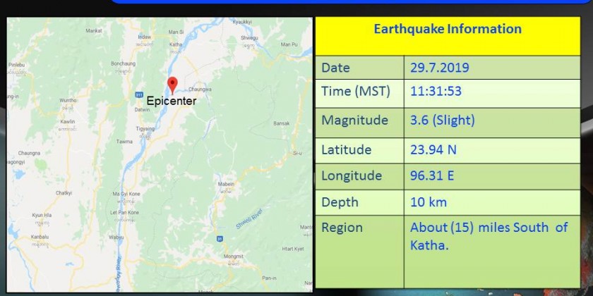 A slight earthquake with a magnitude of 3.6 Richter Scale hit about 15-mile south of Katha and about 72-mile northeast of Kanbalu seismological observatory at 11 hr (31) min (53) sec Myanmar Standard Time on Monday according to the Department of Meteorology and Hydrology.