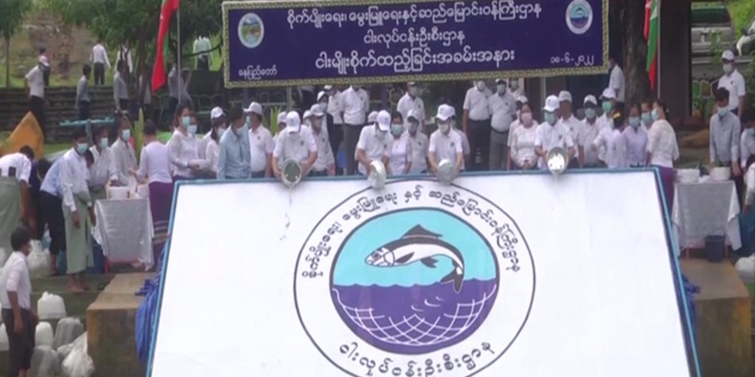 In this ceremony, Rohu fingerlings, swamp barb fingerlings and pond goldfish fingerlings, totalling 200,000 were added into the Paunglaung River.