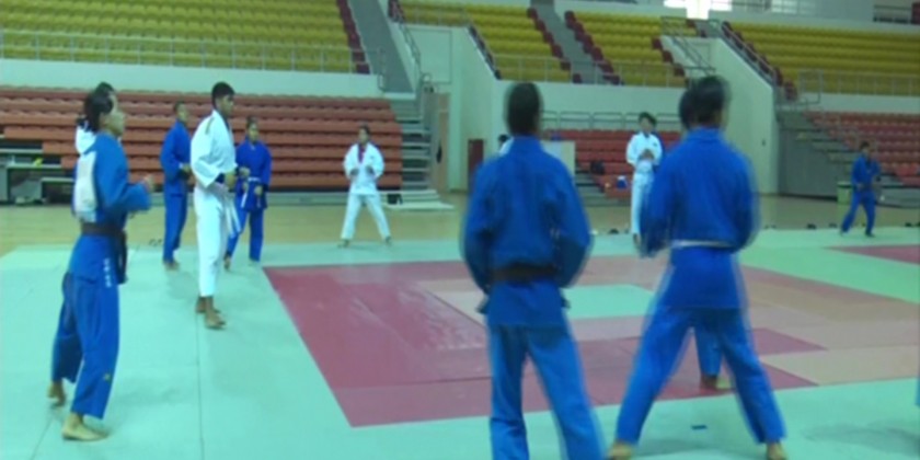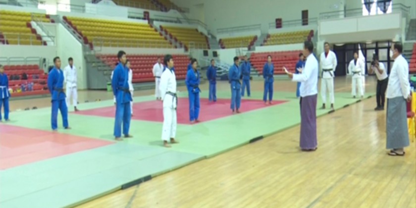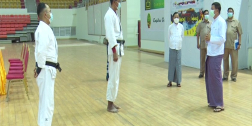 Union Minister for Sports and Youth Affairs U Min Thein Zan together with officials looked into trainings of selected Myanmar sports teams of judo, taekwondo, Wushu (Sanso) and Vovinam who are camping in Nay Pyi Taw to participate in the 31st Southeast Asian Games to be hosted by Viet Nam from 12th to 23rd May 2022.