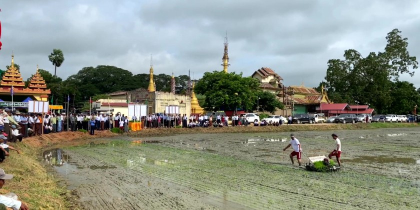 Bago Region Chief Minister U Myo Swe Win attended the demonstration of monsoon paddy cultivation by low-cost rice planting machine in Pyay district on Friday.