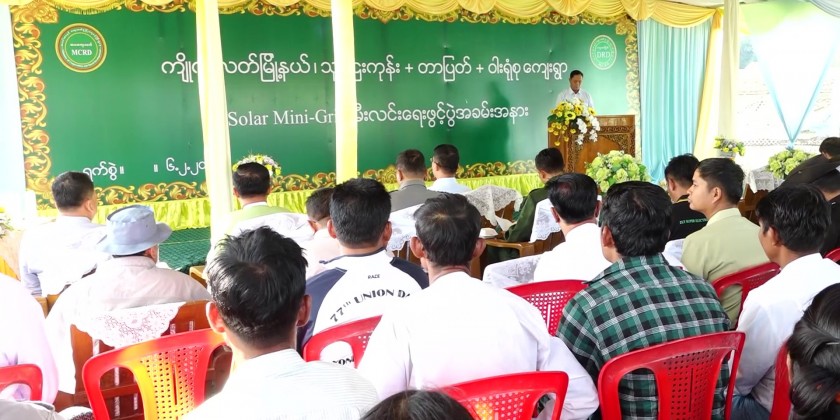 One of local residents showed commitment to retain the electrification collectively and pick up the designated electricity bill. Then, the Union Minister, Chief Minister, region Minister for security and border affairs, permanent secretary of MCRD and official from ZLT Super Electrical Company opened the solar mini grid system electrification by cutting ribbon, sprinkled the Power plant inscription with scented water and inspected the Power plant and Power line installation in the Village.