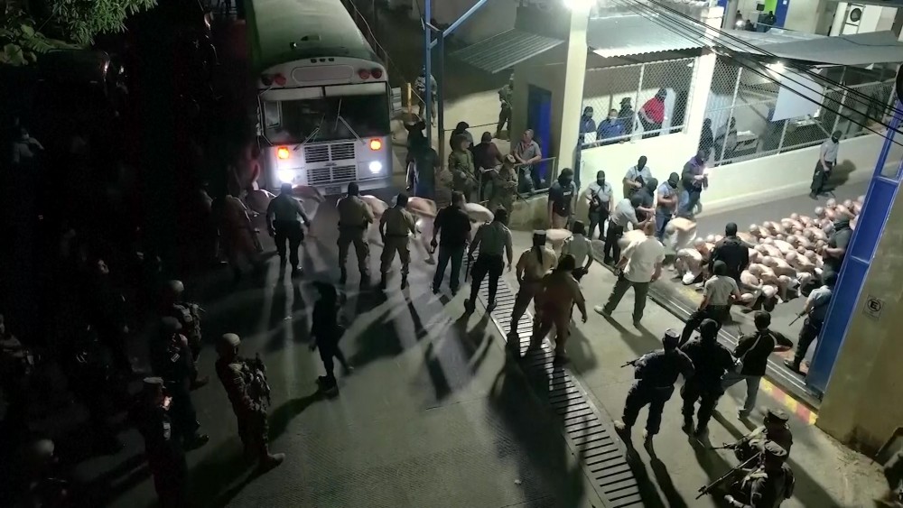 The first group of 2,000 gang members was transferred to a new prison in El Salvador, the country's president Nayib Bukele said on Friday. The prison, located 74 kilometres from San Salvador, has 33 blocks of construction within 236 blocks isolated from the city and is set to hold 40,000 people captured under El Salvador's state of emergency.