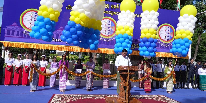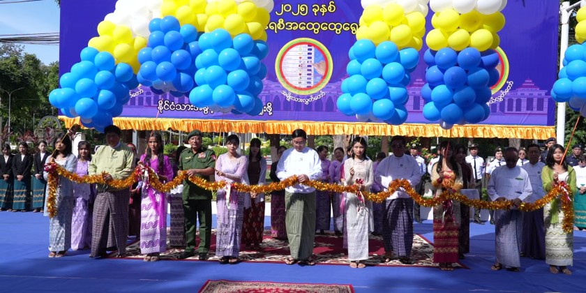 Subsequently, Chief Minister U Tint Lwin, region government officials, and Chairman of the Magway Region Sub Election Commission U Khin Maung Myint jointly cut the ribbon to inaugurate the election awareness-raising billboards and took a group commemorative photo.