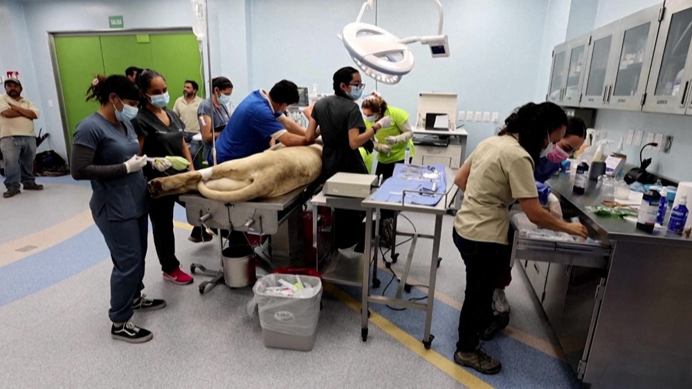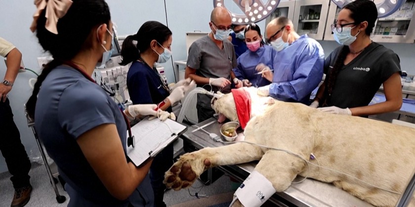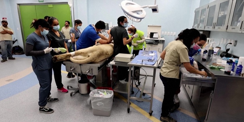 Eleven-month-old lioness "Dinka" undergone surgery for squamous cell carcinoma detected at the base of her skull and ear, at the Comprehensive Center for Animal Medicine and Welfare of the Guadalajara Zoo in Guadalajara, Jalisco state, Mexico. The surgery is performed by a human oncologist alongside a team of veterinarians.
