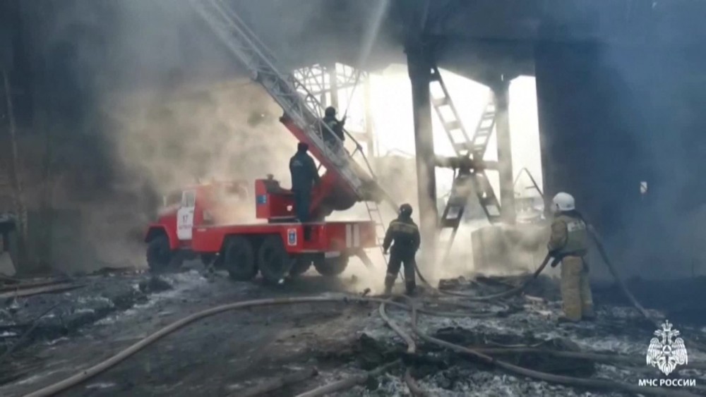 Emergency workers extinguish a large fire at a power station in the Russian Republic of Tuva in southern Siberia on Wednesday.