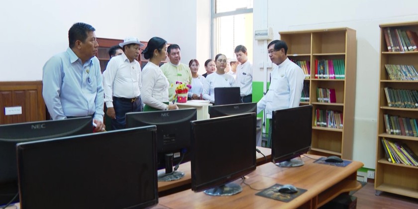 Next, the Chief Minister and ministers inspected cleanliness efforts at the schools, the E-Library rooms, and the school libraries. Responsible officials explained the current status of operations. The Chief Minister instructed that efforts should focus on maintaining clean, pleasant, and beautiful school environments.