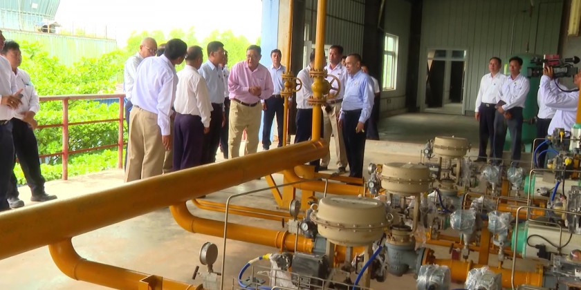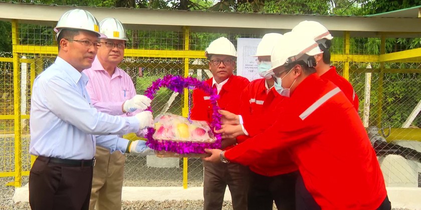 After inspection the Valve Station, the Union Minister and Regional Chief Minister provided fruit baskets and nutritious food to the staff. After that, the Union Minister and the Regional Chief Minister arrived at the natural gas control and distribution station of the Newspaper Mill (Thabaung) and the responsible officials from the Myanmar Oil and Gas Enterprise reported about the completion status of the repairing works of Nyaungdon-Thabaung natural gas pipeline, electricity generation to Newspaper Mill (Thabaung) and timely implementation to distribute natural gas before monsoon.