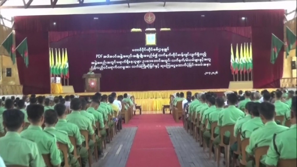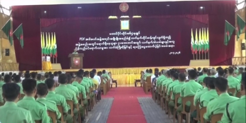 On the morning of April 20, a ceremony to welcome 11 men, who had been members of so-called PDF groups and had come to understand the state and military's peace processes, as they entered the legal fold along with their weapons and ammunition was held at the Aye Chan Phyo Hall of the Southern Regional Command.