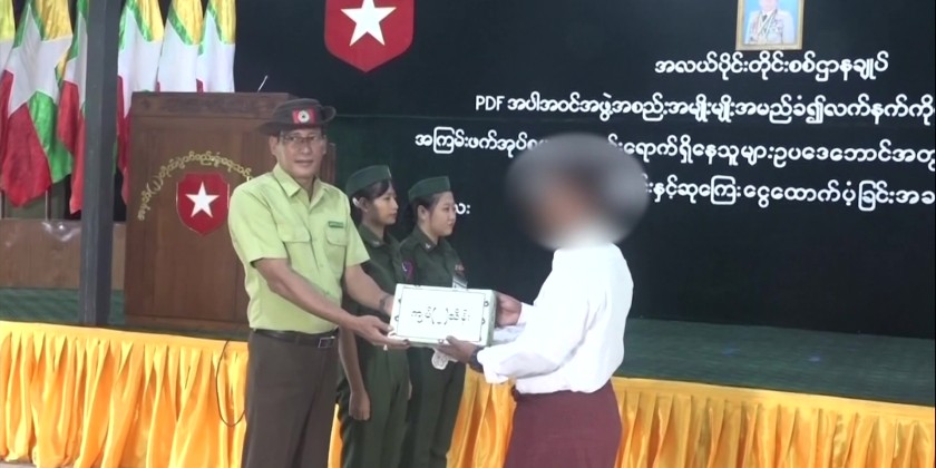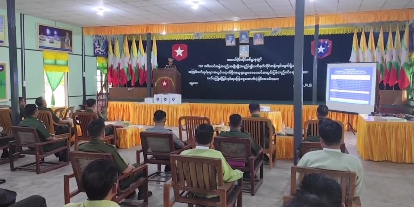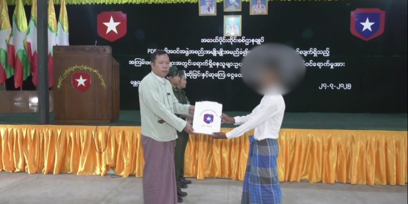 A ceremony was held at a local military hall in Mandalay to welcome these 13 male members of the MDY-PDF group who re-entered the legal fold and to hand them back to their parents. The event was attended by officials from the Central Command, the returning group members, and their parents.
