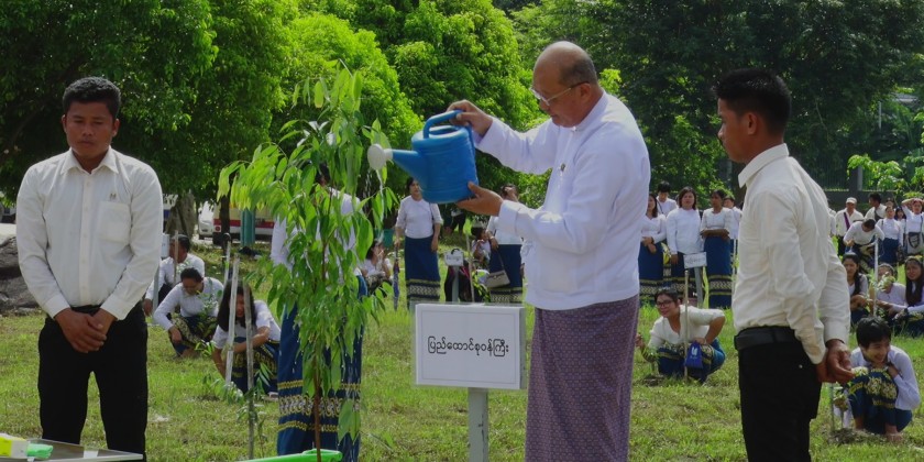 The Union Minister instructed the responsible officials and staff to work together to tend and care for the newly planted trees so that they may survive, flourish, and grow. In this ceremony, a total of 300 trees, consisting of Gangaw and Khaye trees in their assigned locations.