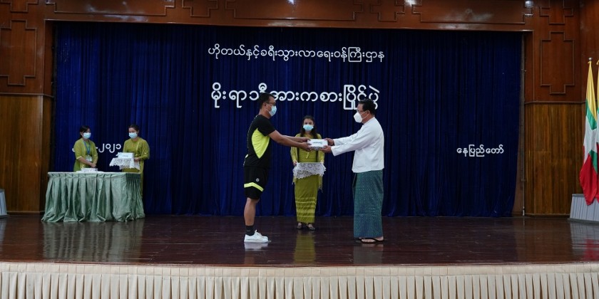 Next, the union minister awarded the first prize winner Sepak Takraw team and the first prize winner of Table Tennis (men, single) and the wife of the Union Minister presented the first prize winner of Table Tennis (women, single).