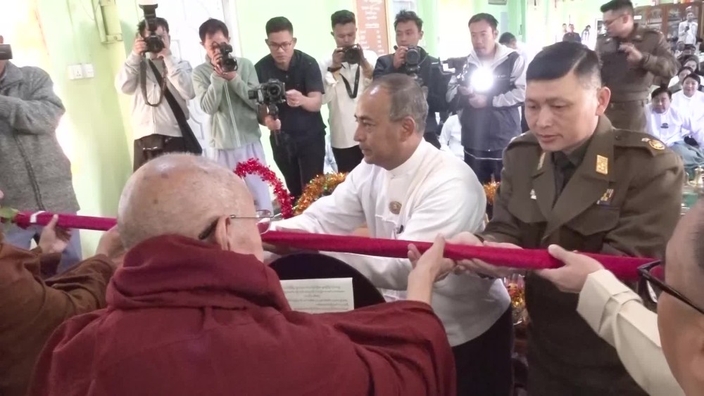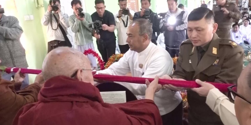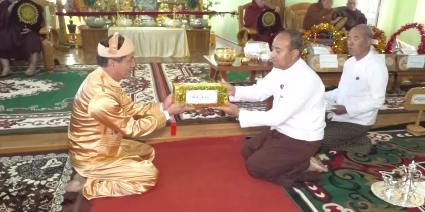 Next, the congregation led by the Shan State Chief Minister observed five precepts administered by SunlunguKamahtan monastery, offered the Paritta water, flower, sand, thread and gravels to the Sangha, took the Paritta Suttas recited by the Sangah and the Paritta water, flower, sand and gravels scattered at the precinct of the pagoda from the direction of East.