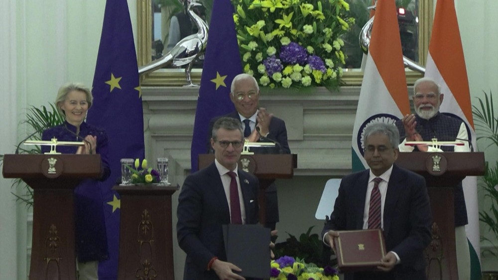 India and the European Union announced the so-called “mother of all deals,” a major trade pact reached after two decades of negotiations to create a market of two billion people. The agreement will cut or eliminate tariffs on nearly 97 per cent of European exports, saving up to 4 billion euros annually in duties, according to the 27-nation bloc.