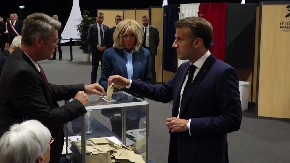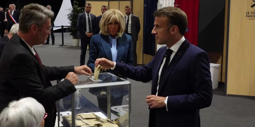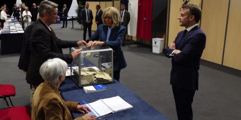 French President Emmanuel Macron and first lady vote in the European elections at their polling station in Le Touquet, Normandy, an election that is likely to bring a clear reshaping of the political landscape in Europe and France.
