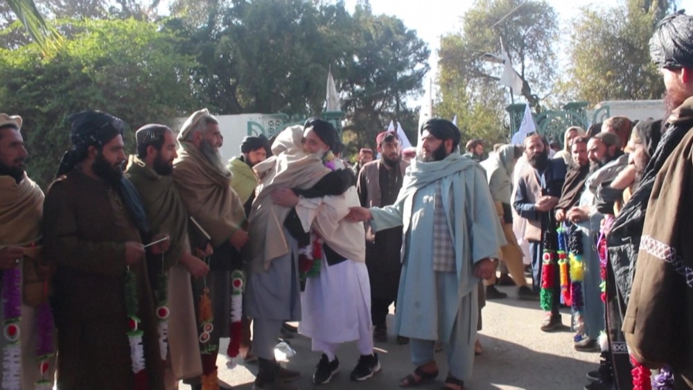 Former detainee and Afghan fighter Khan Mohammed arrived in Jalalabad, Afghanistan, after a prisoner swap with the US. The Taliban government said Tuesday it had released two American citizens from prison in return for an Afghan fighter held in the United States, in a deal brokered by Qatar.