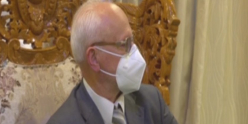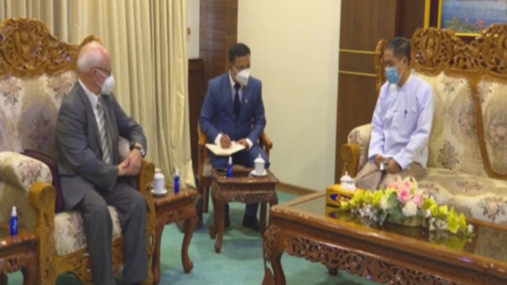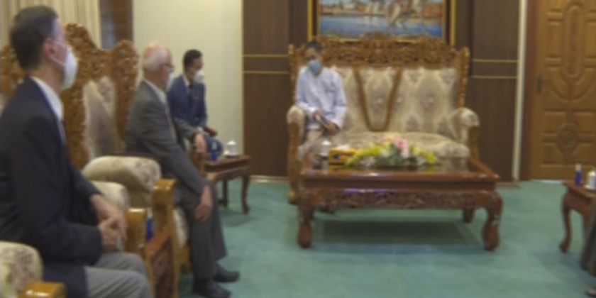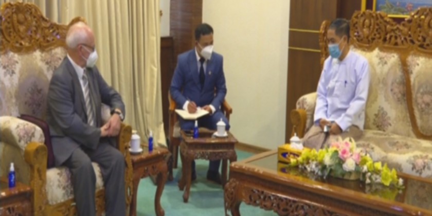 The Union Minister for International Cooperation U Ko Ko Hlaing received the delegation headed by Mr Anatoly Bulochnikov, 1st Vice-President of the Russia-Myanmar Association of Friendship and Cooperation at the Union Minister’s Office in Nay Pyi Taw on 27 October 2021.