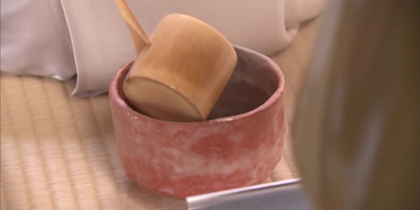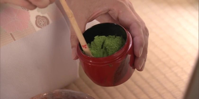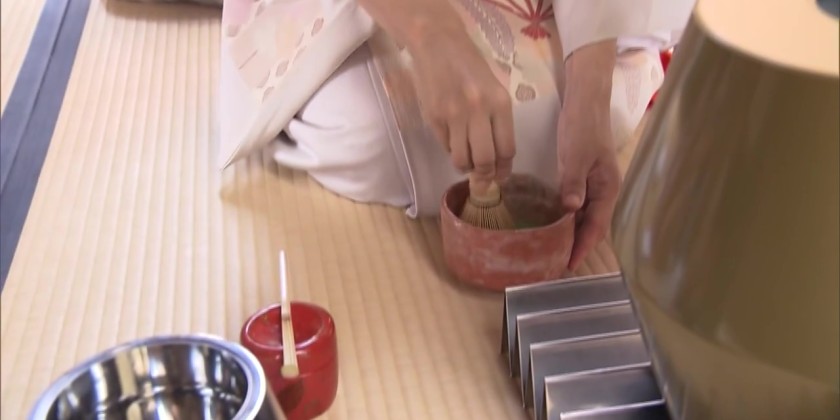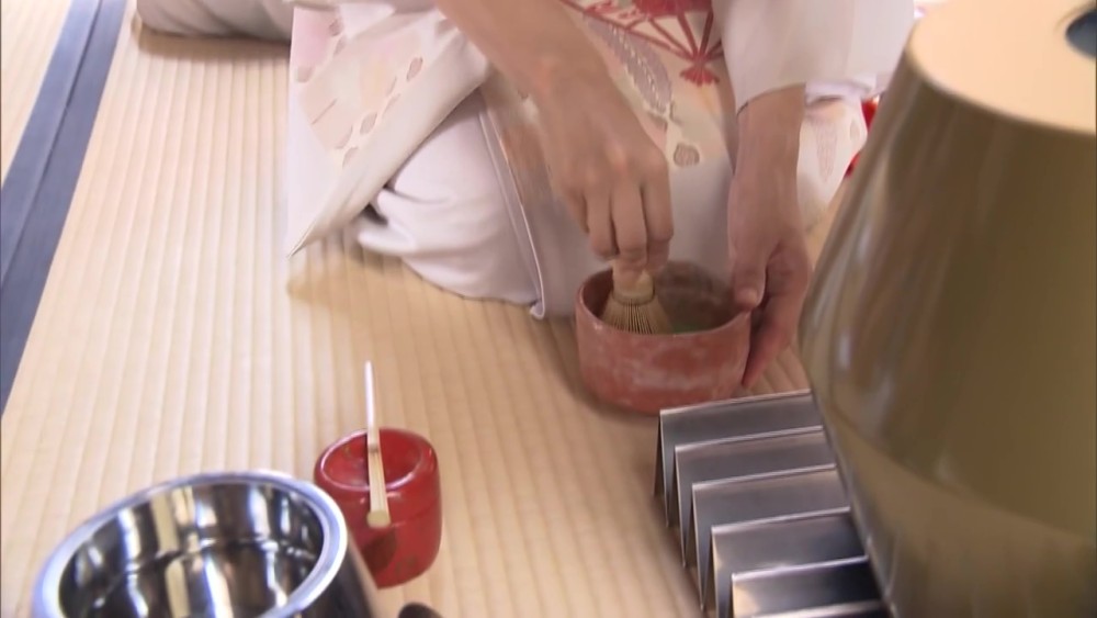 A company specializing in screen-printing recreated the texture of gold leaf on the walls. Bowls of matcha, made using locally produced tea powder, are being served at the exhibit, which opened on Wednesday. The tea room will be open through Sunday.