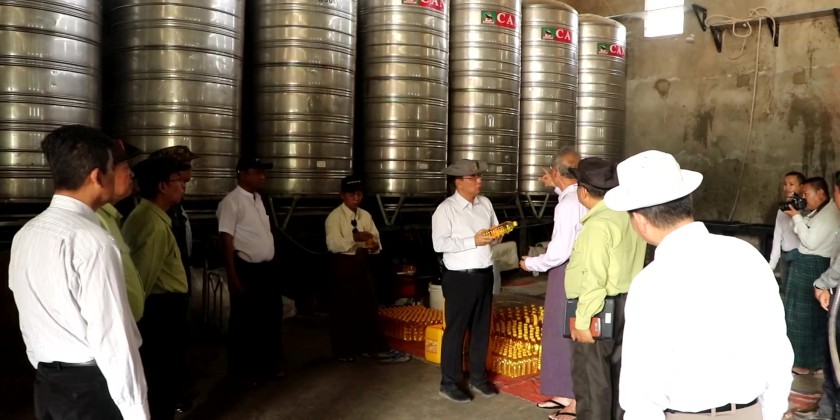 Continuing, the Region Chief Minister visited U Ye Win's groundnut oil mill in Kyun Kone village, Taungoo Township, which operates using renewable solar energy. He observed the oil production and the process of mixing the leftover peanut meal with local raw materials to produce animal feed. He coordinated with responsible officials to support increased production output.