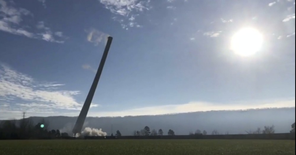 Crews used explosives to topple a 1,000-foot-tall smoke stack at an old power plant in Alabama on Thursday. Workers hired by the Tennessee Valley Authority set off the charges at the site of the Widows Creek Fossil Plant along the Tennessee River.