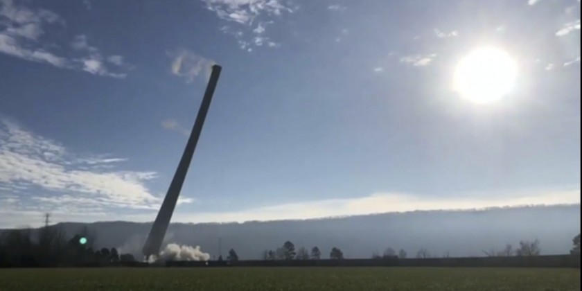 the plant is located about 65 miles northeast of Huntsville and it has been closed five years ago, and workers previously imploded two smaller stacks. The federal utility is cleaning up the plant site in a $66 million project, and it's supposed to be ready for sale and redevelopment next year. Concrete from the old stack will be cleaned and used to fill in the basement of the old powerhouse, the utility said in a statement, and steel from the structure will be recycled.