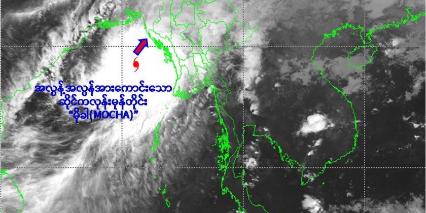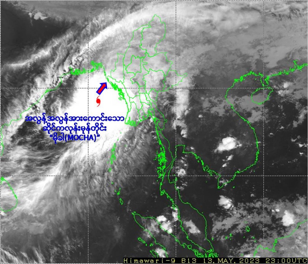 The Extremely Severe Cyclonic Storm “MOCHA” is likely to move North-Northeastwards and the outermost band start to cross the Rakhine Coasts and forecast to cross between Cox’s Bazar of Bangladesh) and Kyaukphyu near Sittwe of Myanmar around afternoon on Sunday as an Extremely Severe Cyclonic Storm “MOCHA”. “MOCHA” is likely continue to move North-Northeastwards towards Chin State and Magway and Sagaing regions and Kachin State as a Very Severe Cyclonic Storm.