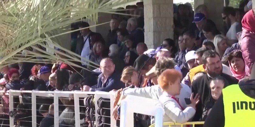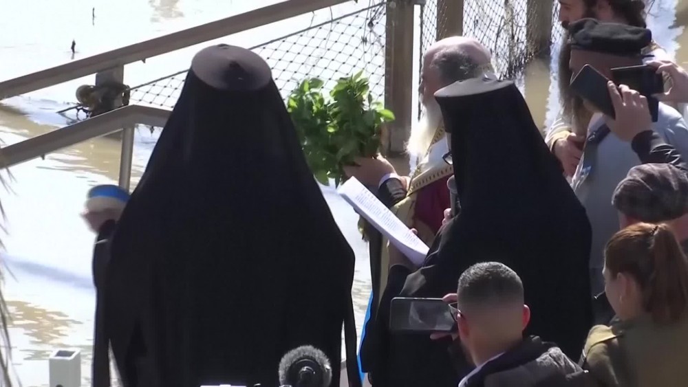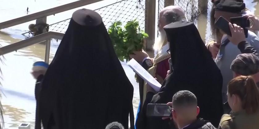 The Greek-Orthodox Patriarch of Jerusalem, Theophilos III, led a procession with hundreds of worshippers. The spot is close to where the River Jordan flows into the Dead Sea and is considered the third most important site in Christianity after the Church of the Nativity and the Church of the Holy Sepulchre. The baptism marks the beginning of Jesus' public ministry. Many modern-day visitors don white robes and immerse themselves in the sacred waters in a show of faith.