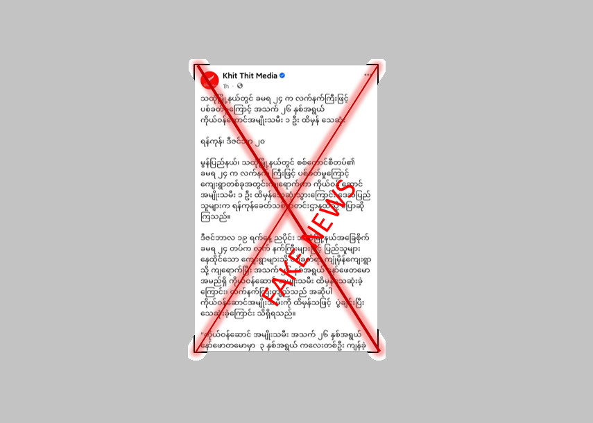 The destructive media Khit Thit is distributing false news through social media stating that Tatmadawmen from Thaton Local Station in Mon State on 19th December launched attack to the residential areas with the use of heavy weapons and a 26 year-old pregnant woman from Kyone Hmain Village was killed. Regarding to this fake news, the concerned security official and locals responded that Tatmadaw didn’t launch any attack, and instead, the terrorists launched attack with the use of heavy explosive weapons.