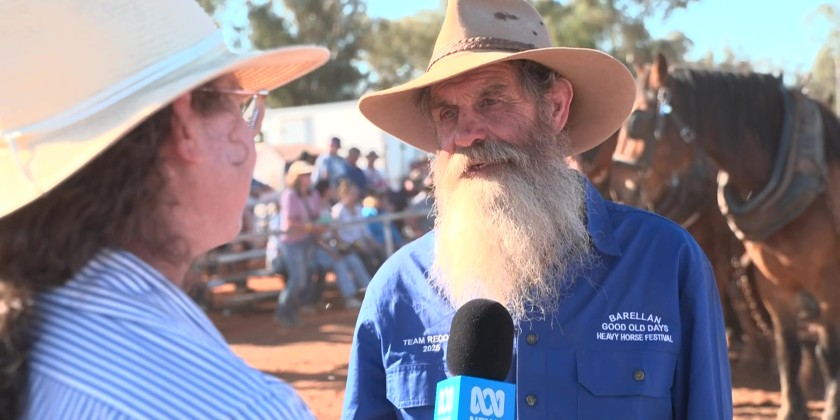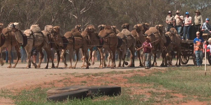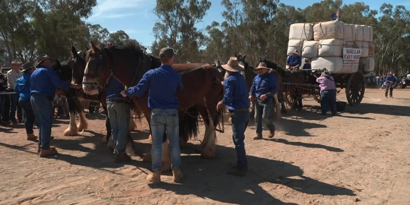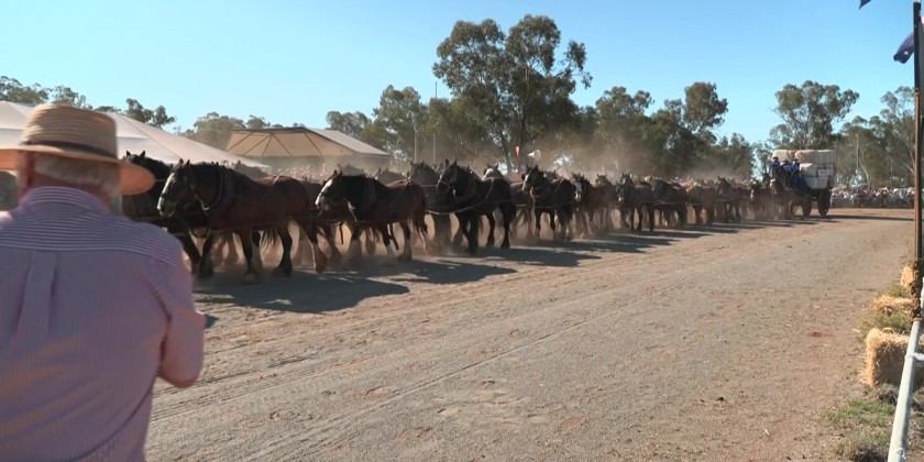 The Good Old Days Festival here at Barellan, about four hours west of Canberra, celebrates Australia’s agricultural history. This year, though a group of horse drawn wagon drivers, known as Teamsters has made history, setting a new record for the most number of heavy horses in harness to pull a wagon. It took about two hours to hitch the team of 60 Clydesdales, Australian Draught and Suffolk Punch horses together.