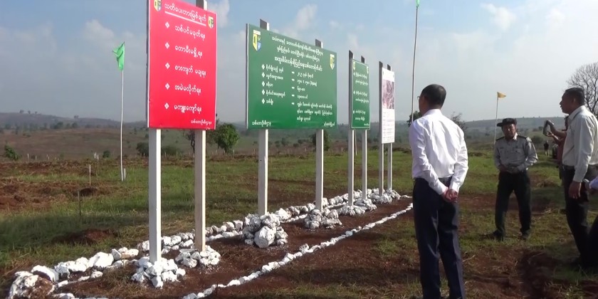 Later, the Union Minister visited the 10-acre special greening plantation being established near Wa-ta-ya ဝါးတရာ Village in Pingdaya Township, where land preparation such as digging and leveling had been completed. He also discussed matters relating to land acquisition for plantation establishment around Pingdaya, coordination with relevant departments and local communities and development and implementation of long-term management plans.