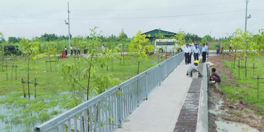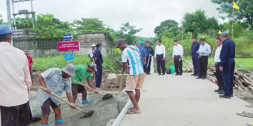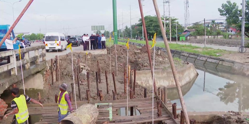 First, the Chief Minister and officials inspected works along the Yangon–Pathein Road in Hlaingthaya Township, including the clearance of garbage and silt with machinery near Nawaday Garden Housing to improve drainage, the construction of bridges, roadside pedestrian platforms, and brick-lined drains. They also inspected the expansion of the Thaunggyar  Creek Bridge. Officials briefed on progress, and the Chief Minister gave necessary instructions.