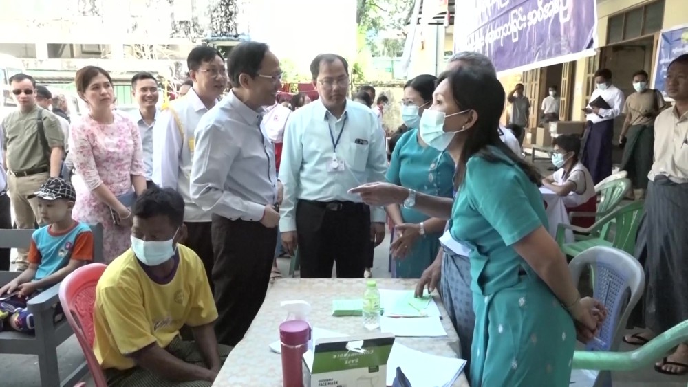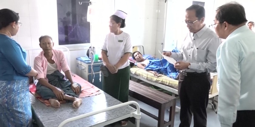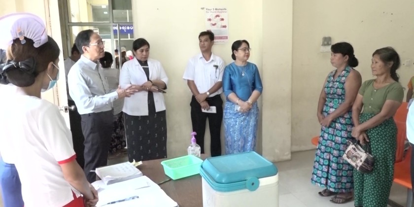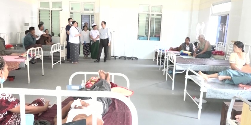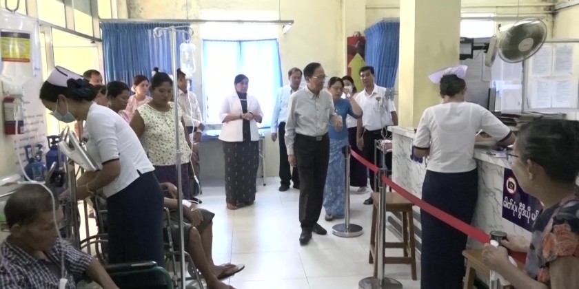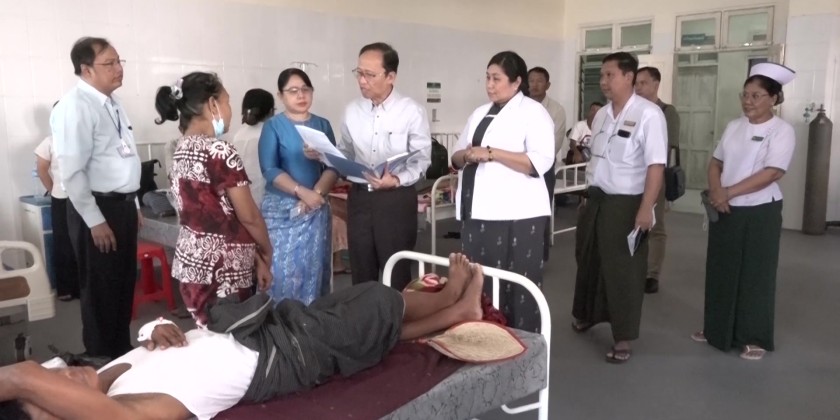 In the afternoon, the Union Minister and officials visited Insein General Hospital. They went to the Emergency Department, General Disease Treatment Ward, and Rabies Vaccination Unit. They met with and offered words of encouragement to patients and their family members who came for treatment.