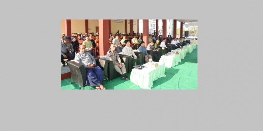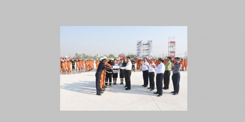 Chief Minister U Myo Aung and officials encouraged the members of Fire Brigade, participate in the demonstration including rapid response measures to fire outbreak, earthquake and other natural disasters, fire extinguishing using High Expansion Foam, as well as rescue and relief measures.