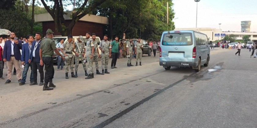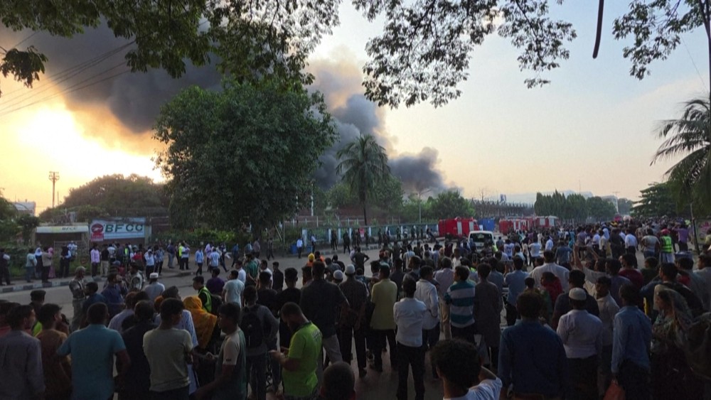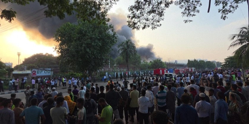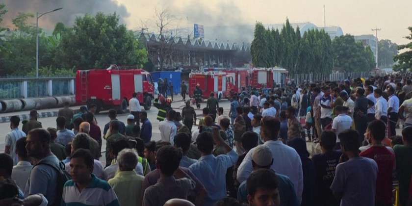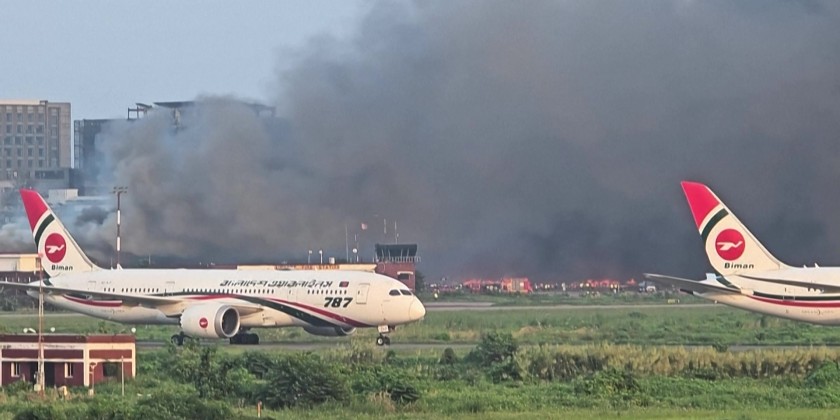 A large fire swept through the cargo terminal of Bangladesh's main international airport in Dhaka on Saturday, forcing authorities to suspend all flights, officials said. The main airport terminal was not affected, but thick black clouds of smoke swept across the runway.