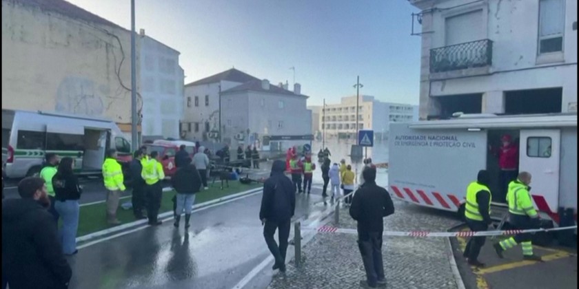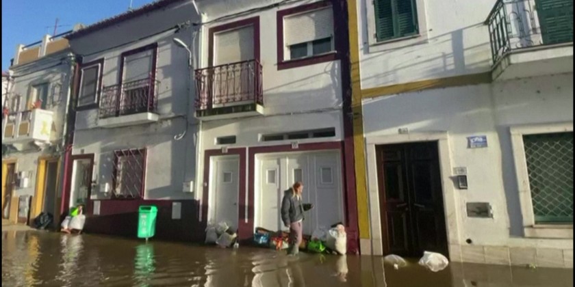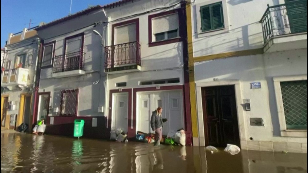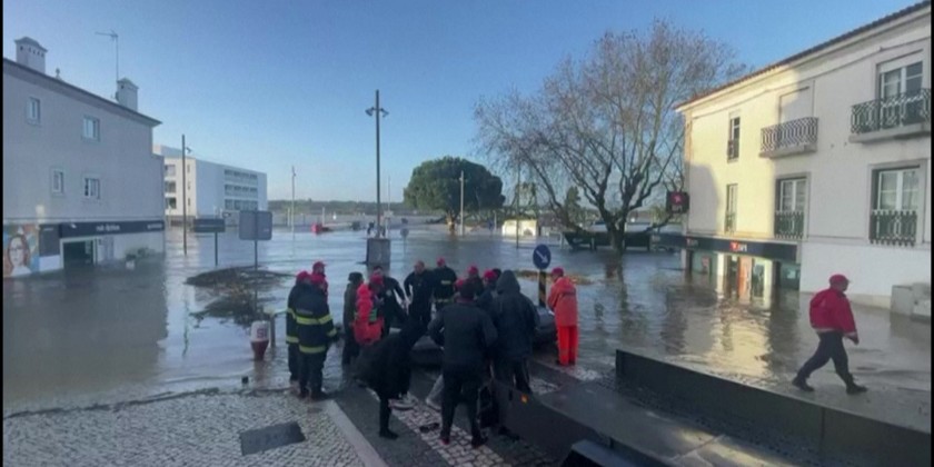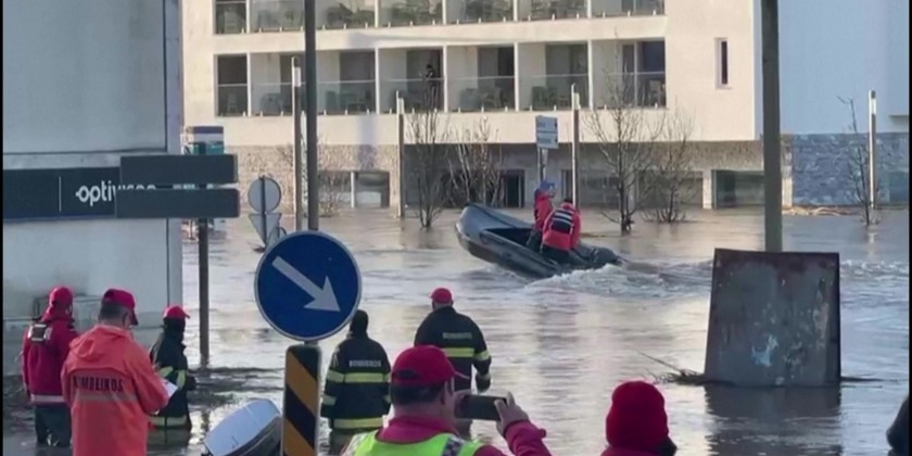 Portuguese firefighters continue to work in Alcacer do Sal, south of Lisbon, after another night of rain left by Storm Leonardo. The floods have seen thousands evacuated across the Iberian Peninsula, and have left a man in his 60s dead on Wednesday, according to the Portuguese national civil protection authority.