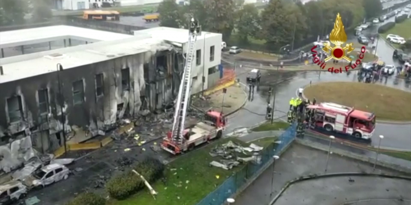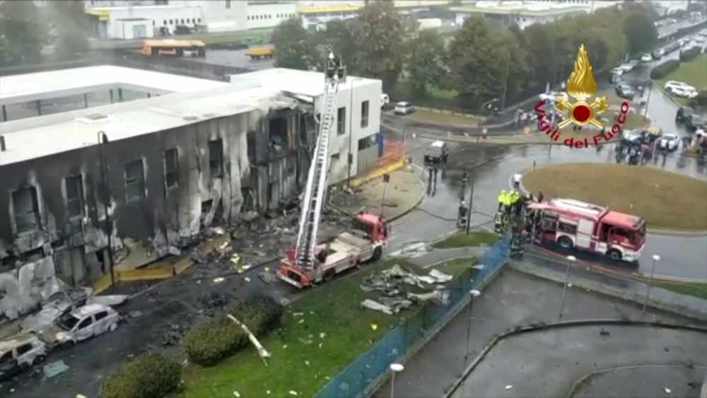 Firecrews in Milan are still working to stabilize a building which was destroyed when a plane flew into it, killing 8 people on board.