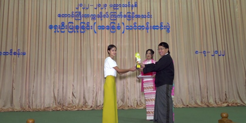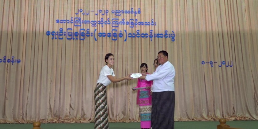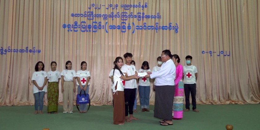 Next, the chief minister awarded the cash prizes to the outstanding trainees, secretary of state government, state advocate general and state minister for security and border affairs also presented the prizes, the chairman of Shan State (South) Red Cross Societies Supervisory Committee U Nyi Nyi presented Advance First Aid Kits to the Taunggyi University Red Cross Society and a responsible person from Taunggyi University accepted. Then, the rector of Taunggyi University Dr. Kaythi Tin presented the certificate of completing first aid training to the instructors and trainees.