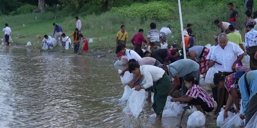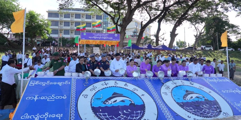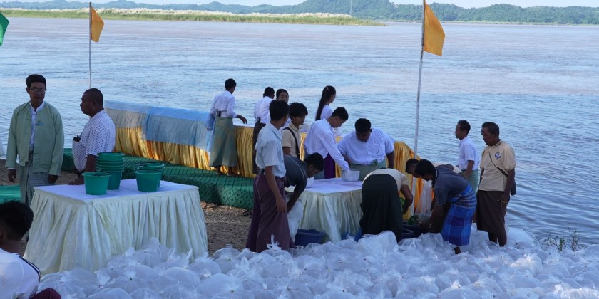 Magway Region Department of Fisheries is conducting fish stocking into the River, streams and dams in the districts and townships of the region to ensure sustainable development of fisheries, prevent fish species extinction, ensure the continuous existence of fish species in natural waters, increase fish production, and create job opportunities for locals.