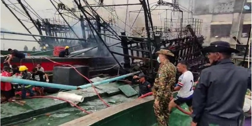 The fire spike spread to nearby two fishing boats. Local military personnel from the Coastal Region Command, members of Myanmar Police Force, Departmentals and social organizations in cooperation with local residents put out fire by 8 fire engines and the fire could be extinguished at about 2:30 pm. Due to the incident, one man was dead4 men were injured.