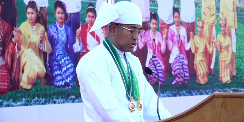 Afterwards, the ceremony to read the message commemorating the 79th Union Day of 2026 continued at the State Hall at 7:00 AM. At the ceremony, Shan State Chief Minister Zayya Kyaw Htin Sithu U Aung Aung, members of the State Government, state-level departmental officials, and local ethnic nationals paid salute to the national flag and paid tribute to the fallen martyr leaders and all members of the forces.