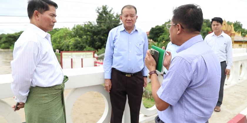 On Saturday, Union Minister for Agriculture, Livestock and Irrigation U Min Naung accompanied by Deputy Minister U Bo BoKyaw and departmental officials inspected water flow along Nga Laik and SinThay Creeks and condition of flood in some residential areas near the creeks. Torrential rain on Saturday triggered a large amount of water flow into the creeks including SinThay in Nay Pyi Taw Union Territory.