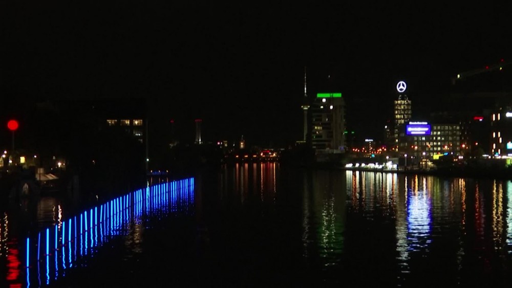 The first day commemorating the 30th anniversary of the fall of the Berlin Wall was marked by a string of neon lights along the River Spree, recreating the former border between East and West Berlin. The blue glow of neon rods stretches 150 metres and is accompanied by 140 flashing rescue lights - representing those who lost their lives trying to cross the border. Artwork is being project onto parts of the wall, which have become an open-air gallery. The wall stood for 28 years before it began being torn down on 9 November 1989.