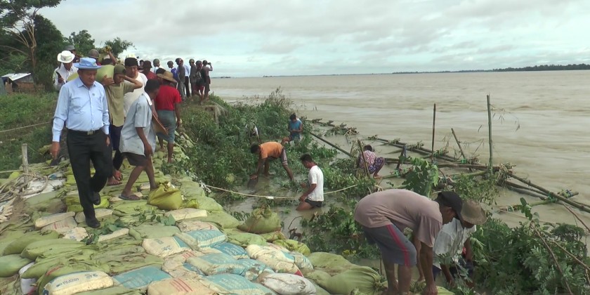 The Deputy Minister is currently in the Ayeyarwaddy Region to assess the strength of dams and monitor flood prevention efforts due to rising river water levels. During the inspection, he reviewed emergency protection activities, water checkpoints, collection of emergency supplies and the employment of labourers.