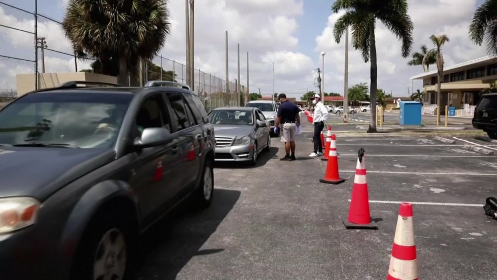 Residents lined up on Wednesday in Hialeah, Florida to pick up unemployment forms at a pop-up drive-through. Florida Governor on Monday announced changes to help processing applications for unemployment benefits.