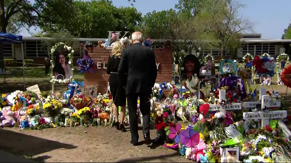 President Joe Biden and first lady Jill Biden on Sunday laid a bouquet of flowers and paused at the photographs of victims of the mass shooting at a Texas elementary school that killed 19 students and two teachers.