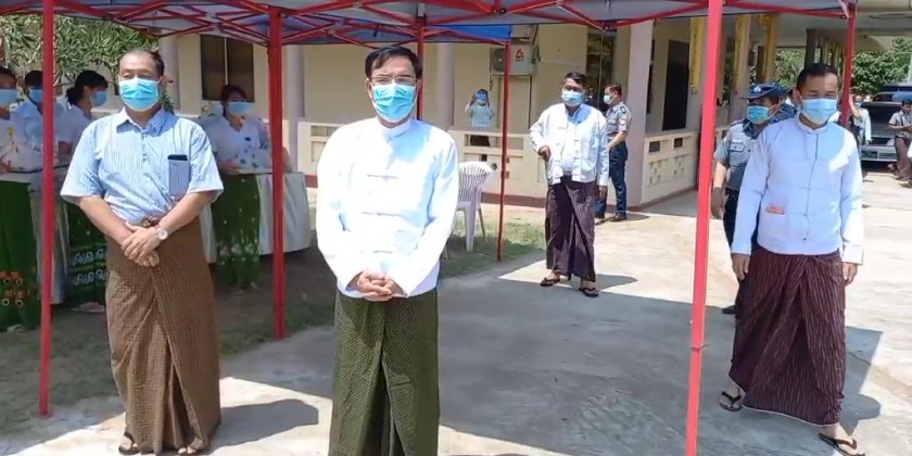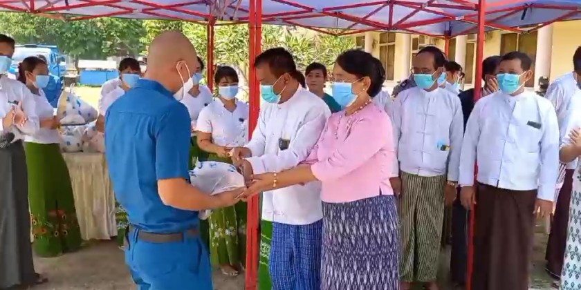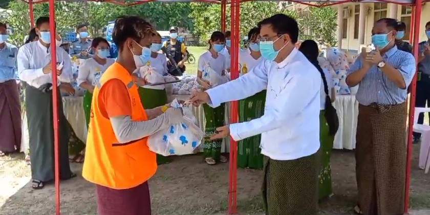 After his speech, the Chief Minister and officials provided rice, cooking oil, eggs and onion to 120 cleaning staff of Bago Township Development Committee.