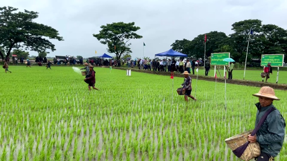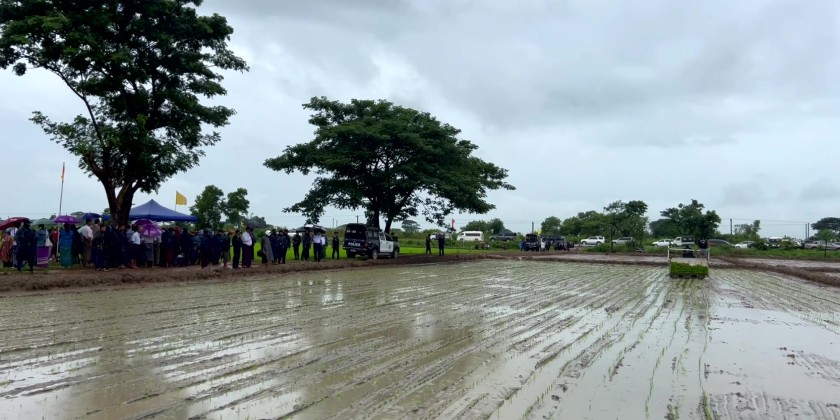 First, Chief Minister U Myo Swe Win visited the large-scale model rain-fed paddy plot in Kyaik Hla Model Village, Waw Township. He observed the communal fertilizer application, met with local rain-fed paddy farmers, delivered a speech, and coordinated with officials to address their needs. Following this, the Chief Minister observed the ongoing rain-fed paddy cultivation using a rice transplanter.